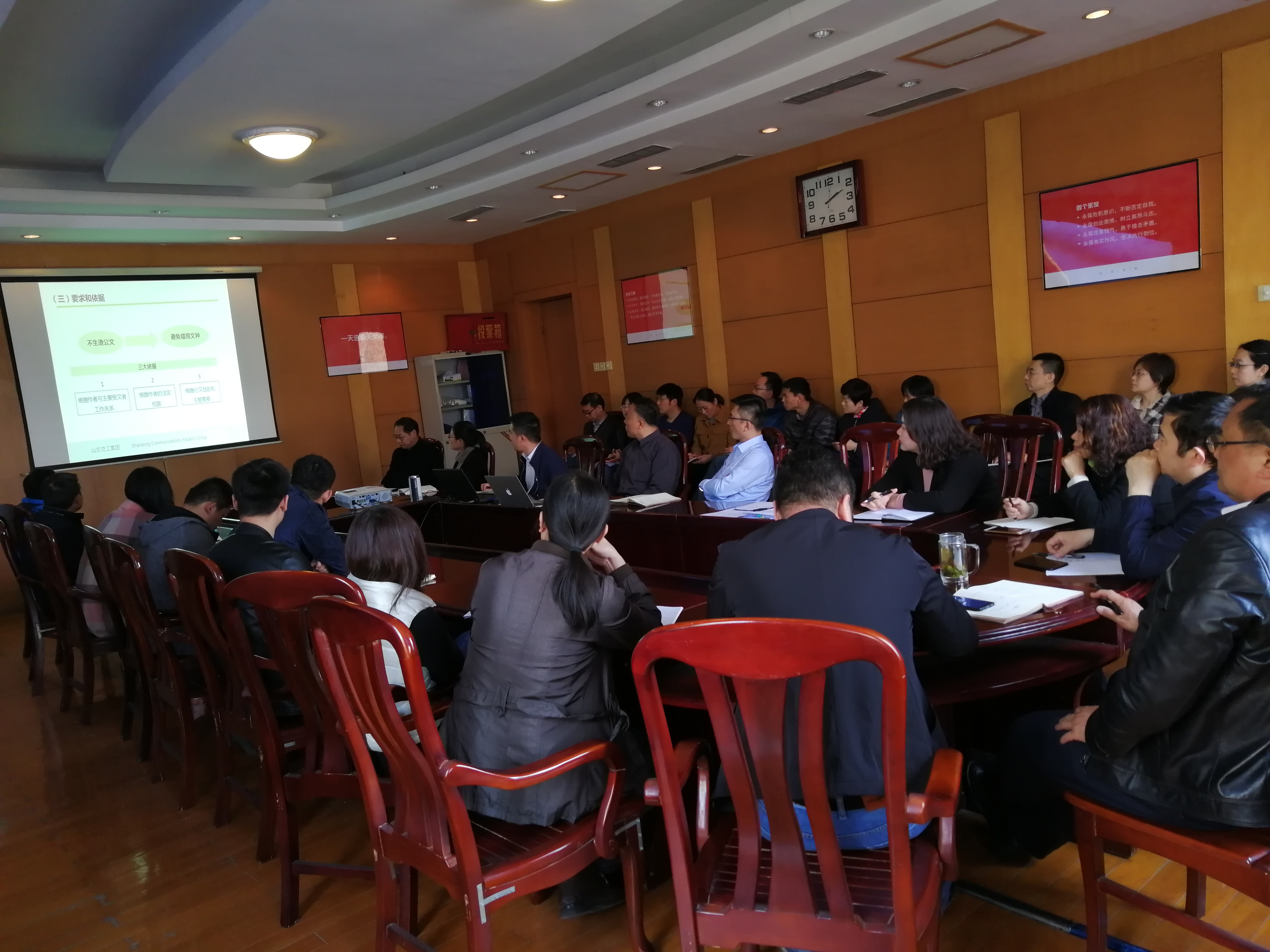 办公室主任宋茂兵作了题为《公文培训》的专题讲座。讲座结合工作实际,分别从公文种类、公文格式、公文写作步骤、常见问题举例四个方面做了详细全面的讲解,运用相关案例分析了公文写作方面存在的问题与不足,与职工进行现场互动,答疑释惑,使大家对公文写作有了更新的认识。